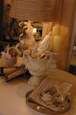 On top are two gorgeous glass lamps with handmade shades - vintage sheet music and player piano music rolls add real personality and warm, flattering light.